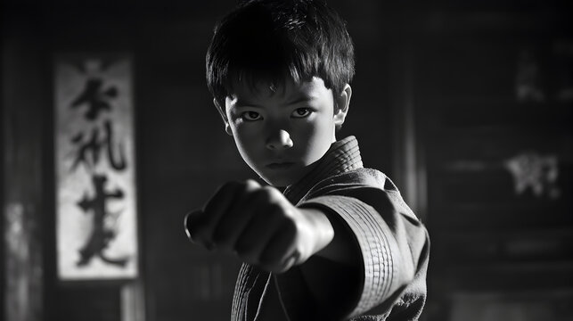 boy practicing martial arts in a dojo, demonstrating focus and discipline