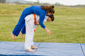 Judokas practicing judo at field