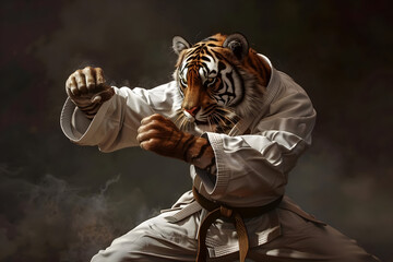 A powerful tiger in a martial arts pose, showcasing strength and agility in an intense and dynamic setting.
