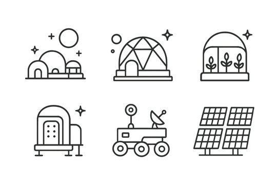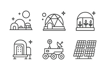 Space Colony Icons. Line style icons of space exploration: Mars colony concept, dome habitat, greenhouse module, airlock shelter,