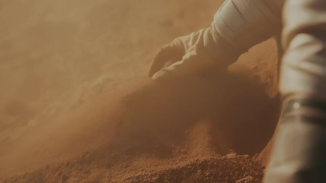 Astronaut wearing a spacesuit explores the surface of mars, gently touching and interacting with the red martian soil, creating a small dust cloud