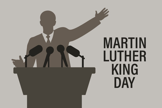 Martin Luther King Jr. Day greeting card design. Silhouette of a politician on a podium with microphones. Vector