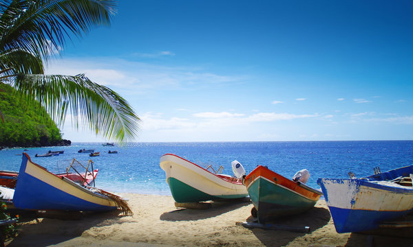 Plage, palmier et bateaux face à la mer des caraïbes. Paysage de la Martinique