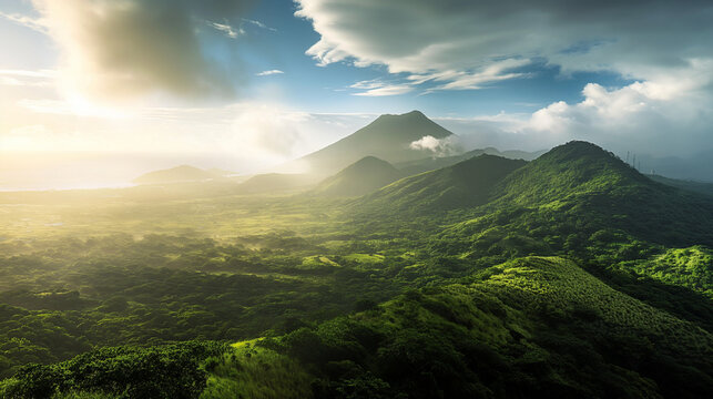 Paradise coast at Saint Pierre with Mt. Pelee, active volcanic mountain in Martinique, Caribbean Sea