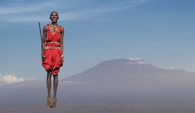 Masai man with traditional dress jumping in front of Mount Kilimanjaro, Amboseli, Rift Valley, Kenya