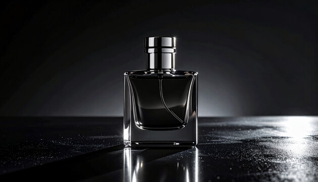 Elegant dark bottle of cologne reflecting light with subtle water droplets and a sophisticated, minimalist background, exuding luxury and allure in a high-definition studio shot