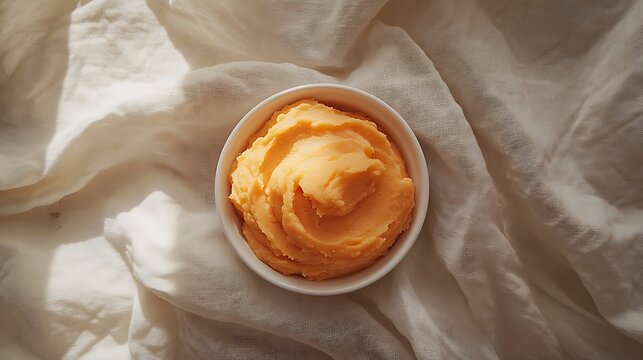 A Bowl of Mashed Sweet Potatoes on a White Cloth