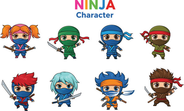 Cartoon ninja character set, colorful warrior poses, kids game design, martial arts vector, masked fighters, action hero illustration