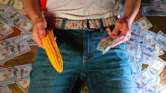 The submissive man holds in his hands a sex toy and a bag of marijuana. The concept of psychological relaxation of a person.