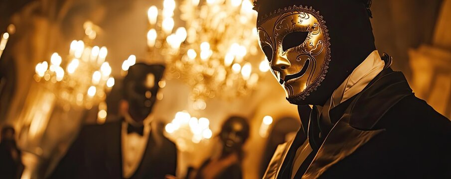 A mysterious masked ball scene featuring elegant figures in lavish attire, illuminated by enchanting chandelier light.