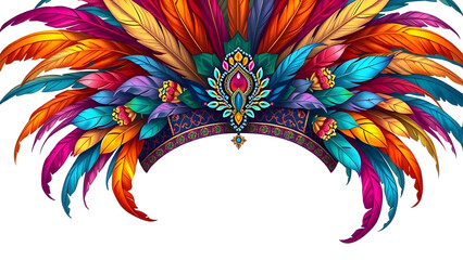 A vibrant headdress of colorful feathers and jeweled embellishments is arranged in a semi-circle against a white background