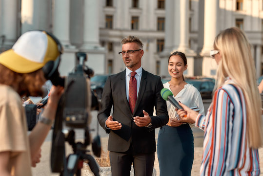 First in the morning. Journalists conducting interview of politician. Journalism industry, live streaming concept.