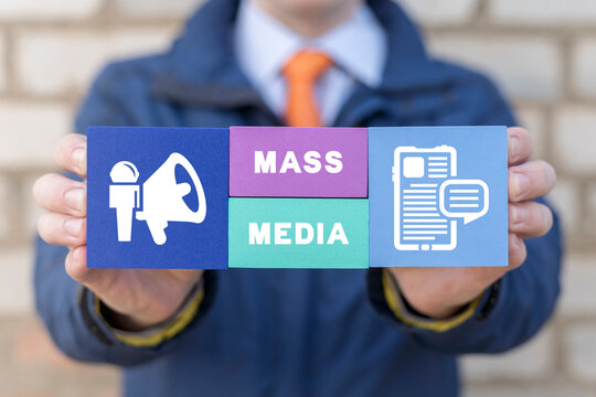 Man holding styrofoam colorful blocks with inscription: MASS MEDIA. Concept of mass media and journalism. PR Public Relations. Marketing campaign.