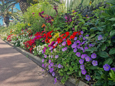 Fleurs colorées en massif, plate bande mauve et jaune, France