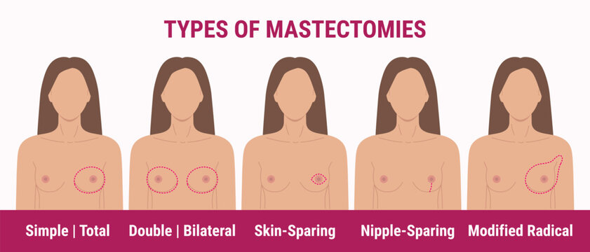 Types of mastectomy double, skin-sparing, nipple-sparing, total. Breast removal surgery. Medical illustration of women chest with scar after surgery. Breast Cancer Awareness Month.
