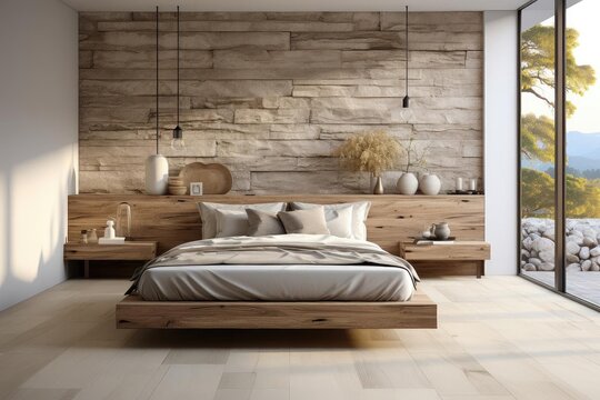 Bedroom in new luxury home with hardwood floors, sliding glass door leading to patio, and skylights with wood cross beams and elegant pendant light