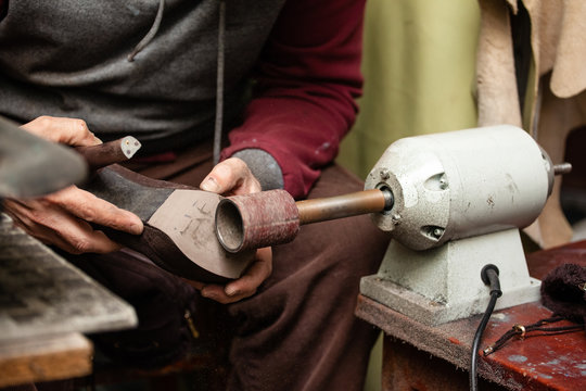 Orthopedic shoemaker working on a handmade shoe based on wooden last