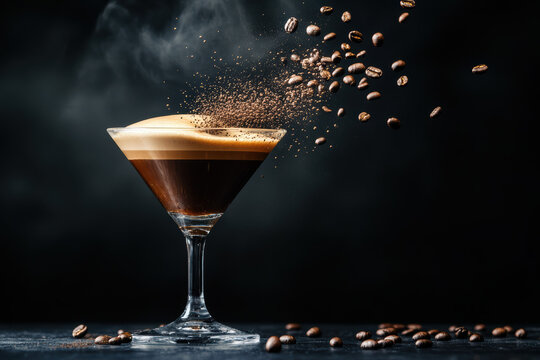 A masterful depiction of a gravity-defying espresso martini. Silky espresso arcs and coffee beans spiral elegantly, with smooth vodka and foamy cream dancing in mid-air, showcasing cocktail artistry.