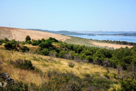 Dalmatian landscape with mountains and Adriatic Sea in wild bushes mastic tree.