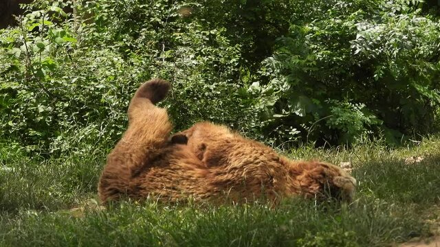 Bear in natural habitat among the trees in the forest.Real wild bears in wooded environment.itch itching itchiness masturbation onanism self-abuse lie back rolling lazy lethargic sluggish drowsy sleep