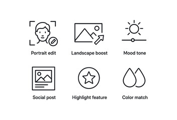 simple outline stroke icon items digital photo filter (uses): portrait edit landscape boost mood tone social post highlight feature color match monoline icons style isolated on white