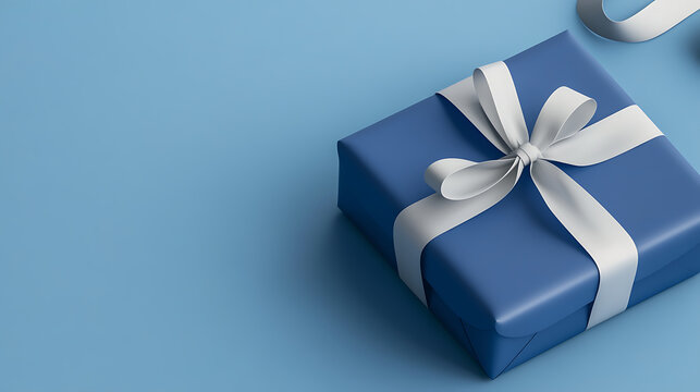 A blue gift wrapped with a shiny white ribbon on a matching blue background creates a serene and elegant visual.  The simple composition highlights the gift and its neat lines.