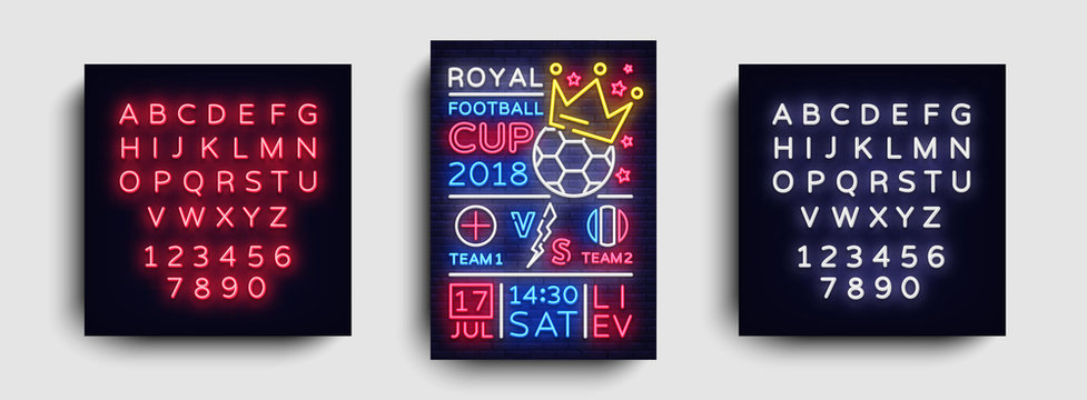 Soccer poster neon vector. Royal Football Cup 2018 postcard flyer design template, light banner, bright brochure soccer championship, invitation to European football. Vector. Editing text neon sign