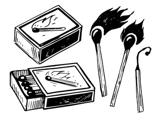 Burnt match stick with fire. Set of matchsticks with sulfur head flaming stages from ignition to extinction. Cartoon spark bonfire vector illustration