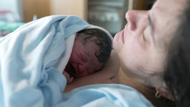 Crying newborn baby resting on mother's chest at hospital clinic right after birth, real life authentic childbirth scene of new infant arriving to this world