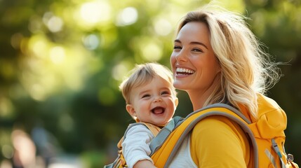 In a sun-drenched natural setting, a joyful mother shares a laugh with her baby, capturing the essence of maternal love, joy, and relaxation in fresh air.