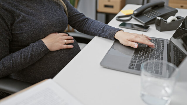 A pregnant woman stands in a modern kitchen, smiling while resting her hands on her belly.