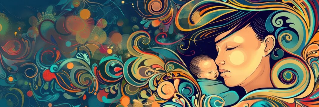 Celebrating world maternal mental health day with artistic mother and child illustration. Horizontal banner. Copy space. Postpartum depression concept. Postnatal care services, women's wellness