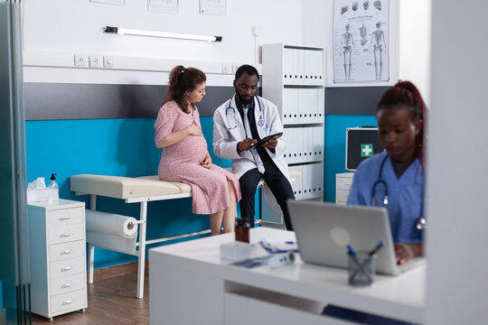 Doctor showing digital tablet with diagnosis to pregnant woman, checking healthcare in cabinet. General practitioner using device to consult young patient with pregnancy. Medical care