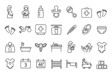 Pregnancy and baby care line icon set. Maternity, childbirth, newborn and motherhood concept. Pediatrics, infant, healthcare and family symbols. Outline vector pictograms.