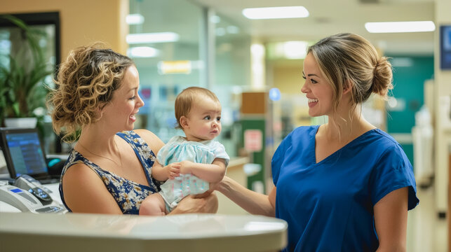 Mother with baby at reception desk of clinic talking about her appointment with female receptionist at health care center - Models by AI generative
