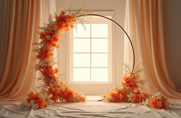 Elegant wedding maternity backdrop featuring half-circle hoop adorned with vibrant orange, white flowers. Flowing satin drapes frame window, creating dramatic, softly lit scene perfect for