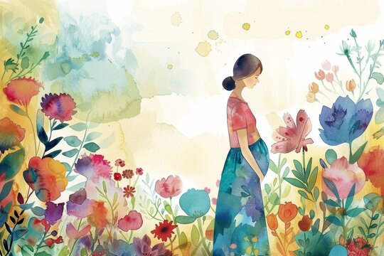 beauty of pregnancy watercolor illustration, mother to be growing belly, surrounded by delicate flowers, butterflies, and other symbols of new life and fertility, baby shower template