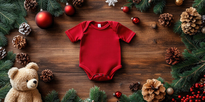 Red babygrow lying on a wooden surface beside a teddy bear, surrounded by Christmas decorations like pine branches, baubles, and knitted clothes, celebrating a new baby's arrival