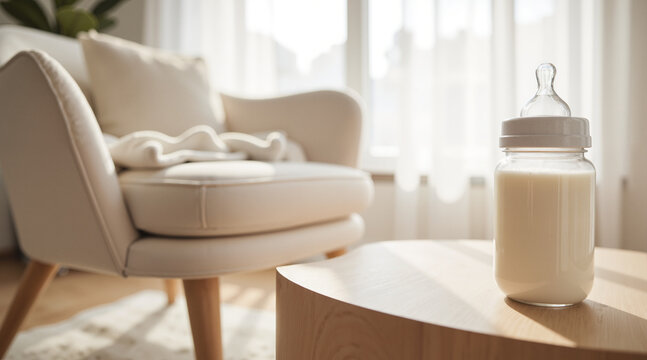 Nurturing Space Setup – Baby Bottle with Milk and Comfortable Nursing Chair for Parenting Blogs, Breastfeeding Awareness, and World Breastfeeding Week Resources