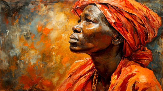 An older black woman wearing a red and orange turban background with copy space. Generative AI
