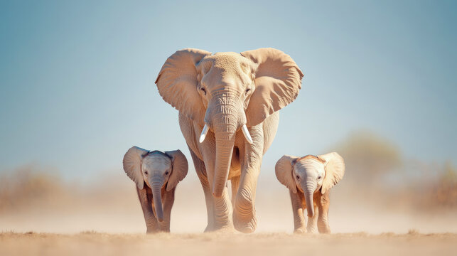 Majestic adult elephant matriarch proudly leads her two adorable, light-colored calves across sun-drenched, dusty African savanna under serene blue sky