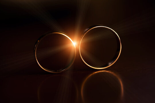 Two elegantly intertwined wedding rings sitting atop a sparkling surface, representing timeless love and commitment, capturing the essence of matrimonial bonds and unions.