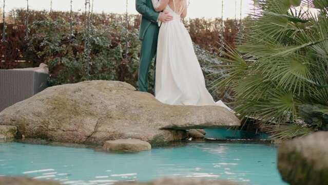 Close-up of wedding rings on a document with couple in the background. Marriage contract concept. Design for poster, legal services advertisement