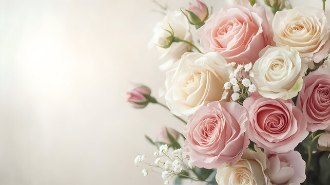 Elegant white roses and gift box arrangement on white wooden surface for special occasions