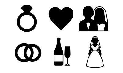Wedding ceremony silhouette icons set – simple marital and celebration symbols