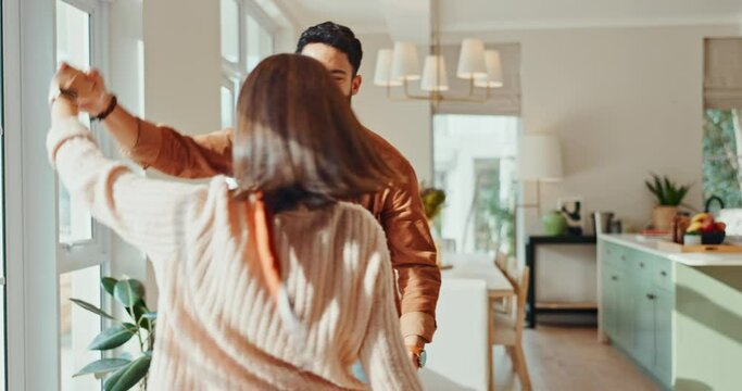 Love, dance and couple in home for fun, bonding and loving relationship in living room. Dating, marriage and happy man and woman dancing together for relaxing, listening to music and enjoy weekend