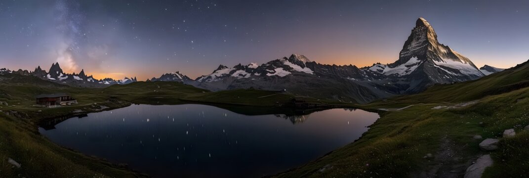 A scenic view of the matterhorn mountain range reflecting in a calm alpine lake at twilight