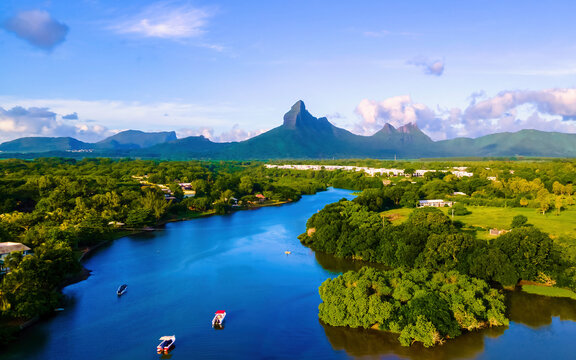Le Morne Mountain, Mauritius, Africa, as seen from above. Generative AI