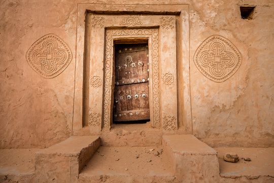 Famous ancient arabic door paintings at medieval bricked house in World Heritage Site Walata, Mauritania