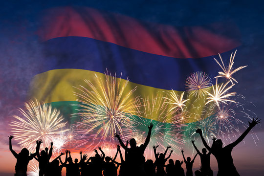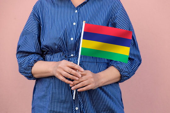 Mauritius flag. Close up of woman's hands holding Mauritius flag.